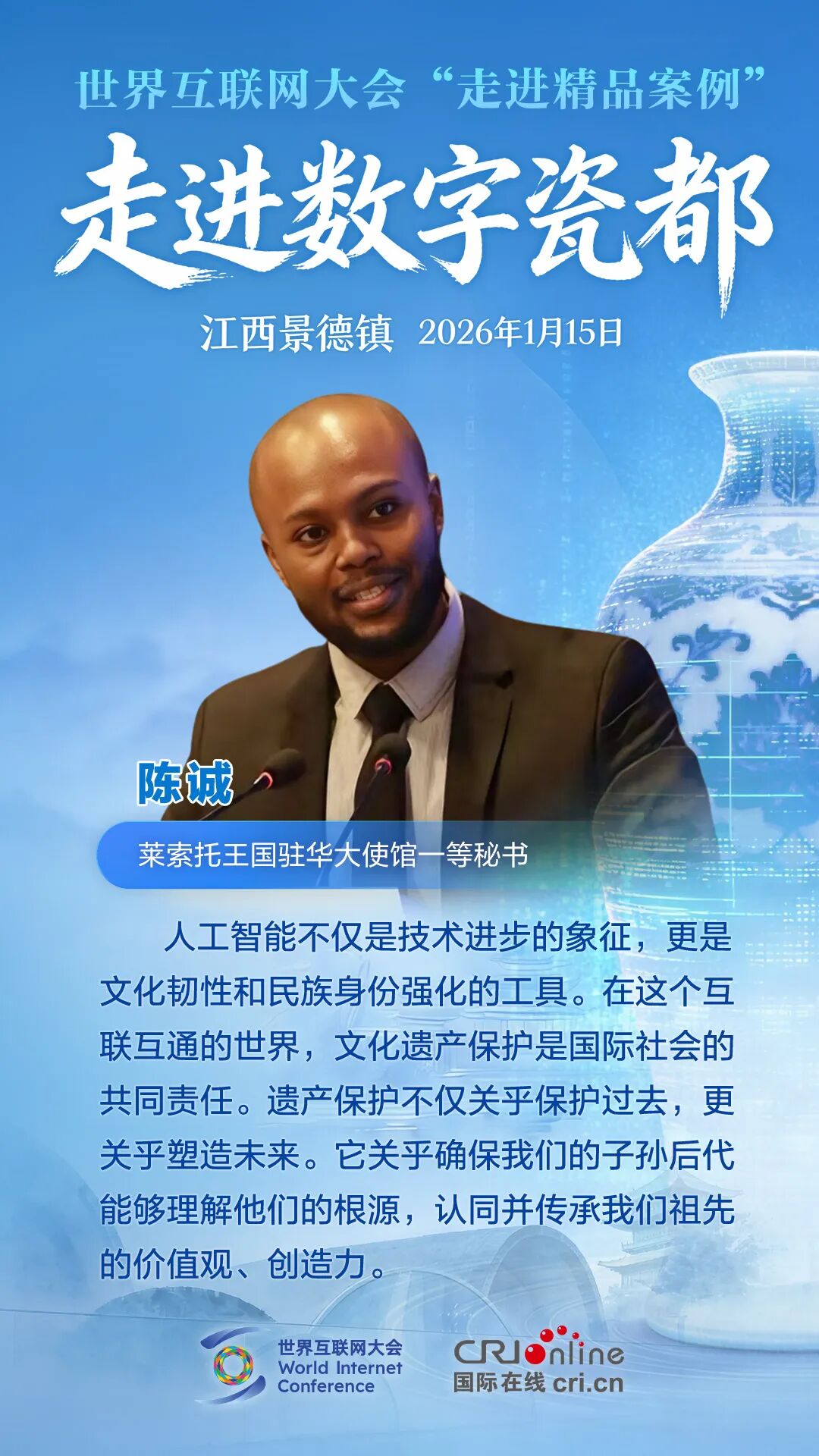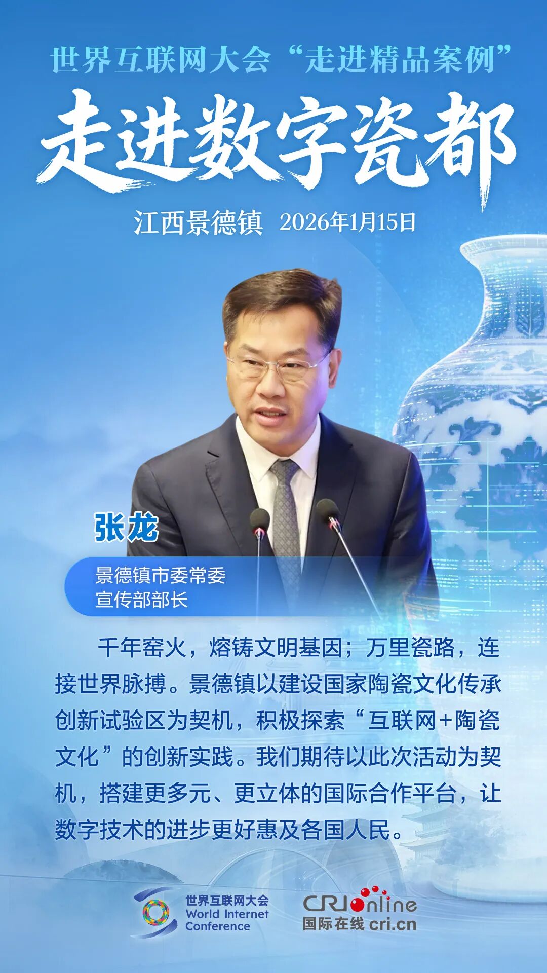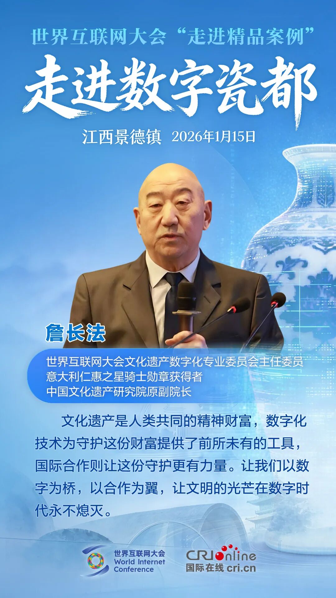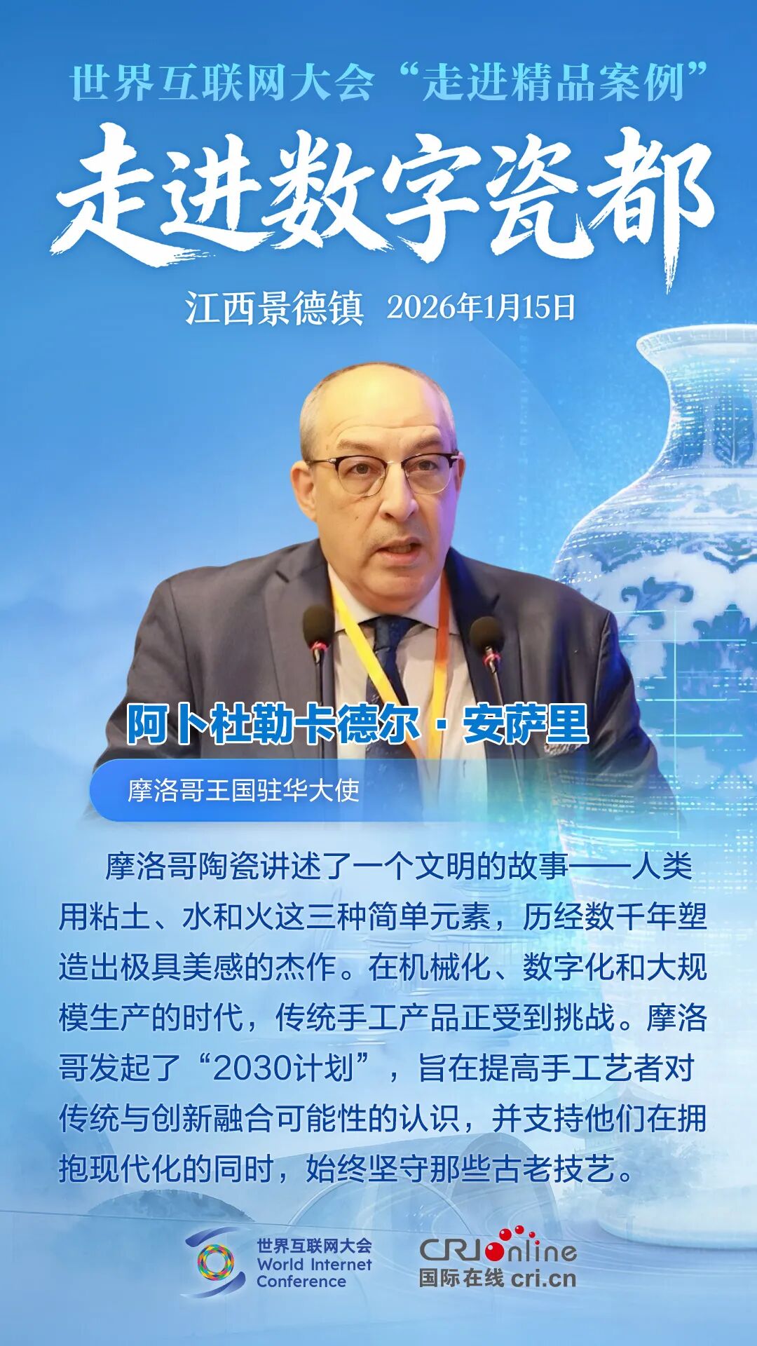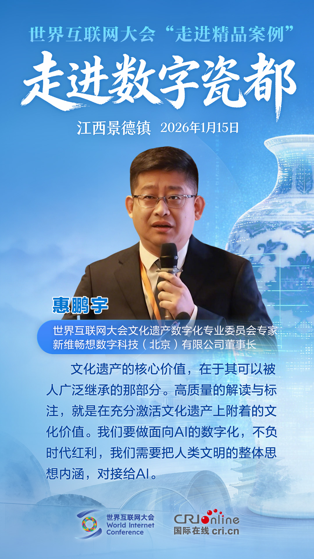 1月15日,世界互联网大会“走进精品案例”之“走进数字瓷都”活动在江西景德镇举行。各方嘉宾汇聚一堂,围绕数字技术赋能文化遗产保护展开深度对话,分享全球实践经验。他们有哪些精彩观点?一起来看!